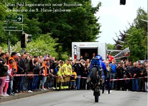Heute, ein Jahr später, ist Bliedungs Zorn wieder verflogen. Denn nicht nur das Wetter spielte beim diesjährigen Hanse-Jamboree mit, die Motorradsause hat auch erneut Platz an einem zentralen Ort der Gemeinde gefunden. Zwar nicht rund um das Rathaus, aber immerhin am Bürgerhaus. Und so waren auch die Besucher wieder da und bestaunten gelungene Motorradstunts auf der extra gesperrten Beckersbergstraße.