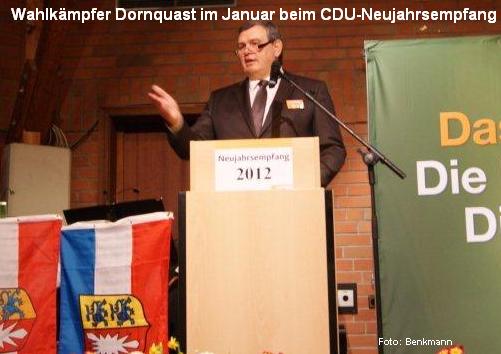 Kein Kaltenkirchener CDU-Mitglied sagt es öffentlich, aber manche glauben es: Dornquast könnte in Kiel seine Fäden gezogen haben, um eine Dodenhof-Expansion abzuwenden – schon um eine Konkurrenzsituation zum geplanten City Center Ulzburg zu vermeiden. Deutlicher werden CDU-Veteranen aus der Nachbarstadt dann schon, wenn sie auf Dornquasts Rolle als Landtagskandidat der Christdemokraten im Wahlkreis Segeberg-West angesprochen werden: „Da hat er sich gefälligst auch für unsere wirtschaftlichen Interessen einzusetzen, tut es aber nicht genügend“, schimpft ein langjähriges Parteimitglied aus Kaltenkirchen.