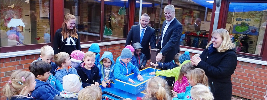 Zusammen mit Christian Röpkes, Regionalleiter der Raiffeisenbank eG in Henstedt-Ulzburg wurde das Spielgerät offiziell an die Kita Bürgerhaus übergeben. Die Raiffeisenbank hat für die neue Matschanlage 1.000 Euro gespendet.