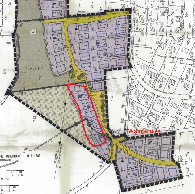 In dem Schreiben das Manke an die Trotz-Anwohner geschickt und die Baumaßnahme angekündig hat, beruft sich die Firma auf den Bebauungsplan Nr. 38, 5. Änderung. Die HU-Nachrichten haben den Plan, der aus den 80-Jahren stammt, oben einmal ausschnittsweise abgebildet. Und danach sieht es so aus, als ob es es doch auch anders gehen könnte, als einen Wanderweg zur Baustraße zu machen. Zu sehen ist nämlich eine Anbindungstraße in nördlicher Richtung, Darauf weist auch Leserin Elke Lüdemann hin. Sie schreibt: „Der ursprüngliche Plan sah vor, die Erschließung neben der Zufahrt/Ausfahrt der Feuerwehr im Trotz vorzunehmen. Das Grundstück dafür ist nach wie vor vorhanden. Diese Maßnahme wäre für alle Beteiligten sicherer und wesentlich weniger aufwändig. Warum wurde das verworfen? Die Feuerwehr verliert dadurch doch nicht ihre zusätzliche Auffahrt!“